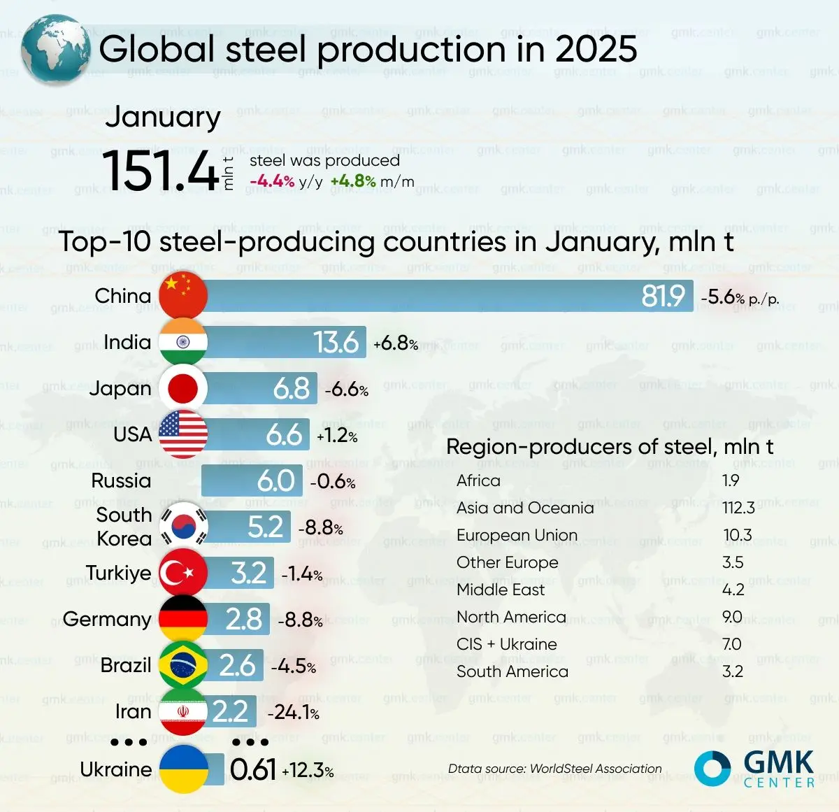 Global steel production in January 2025 decreased by 4.4% compared to the same month in 2024 – to 151.4 million tons.